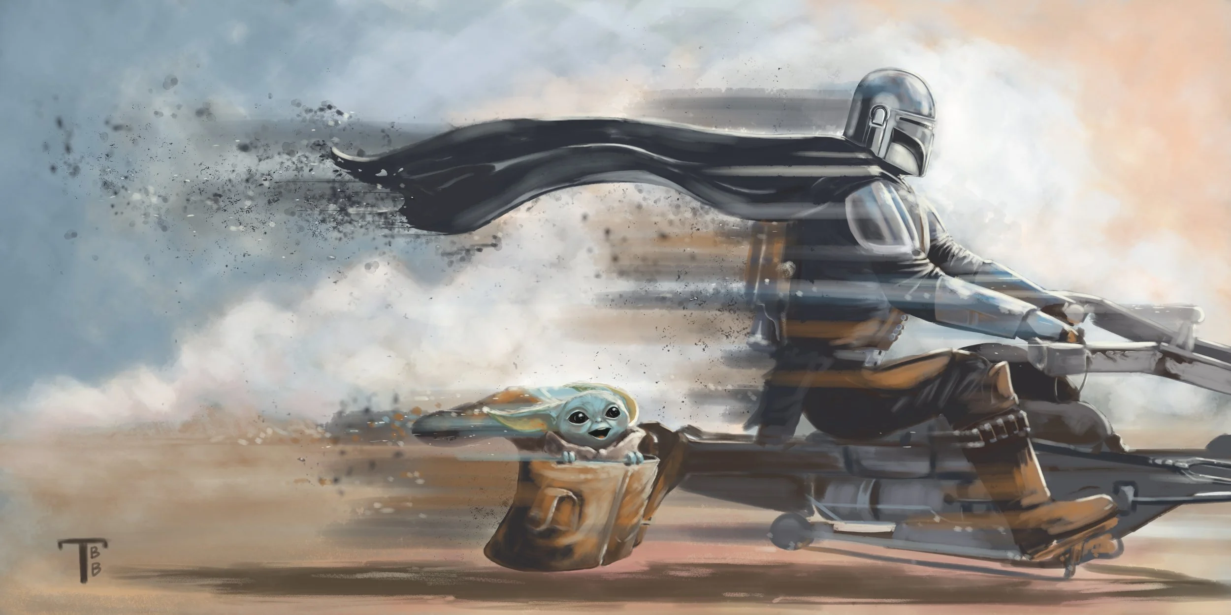 This artwork is inspired by Star Wars: The Mandalorian. This giclee comes hand-numbered and with a certificate of authenticity.
